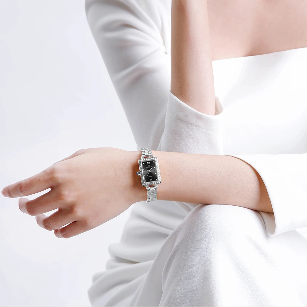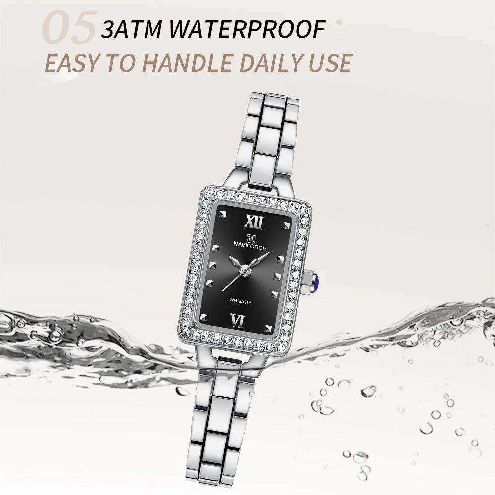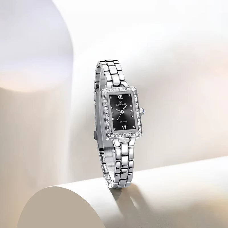 The Naviforce NF5043 watch is one of NAVIFORCE’s original premium products, featuring a geometric case design that not only showcases modernity but also exudes a unique vintage artistic beauty. The prominent Roman numerals and three-dimensional studs make it stand out in detail, full of vitality and personality. The square case adorned with sparkling diamonds adds a touch of luxury and elegance, allowing your customers to radiate a distinctive charm and become the focal point of fashion flair when wearing it.