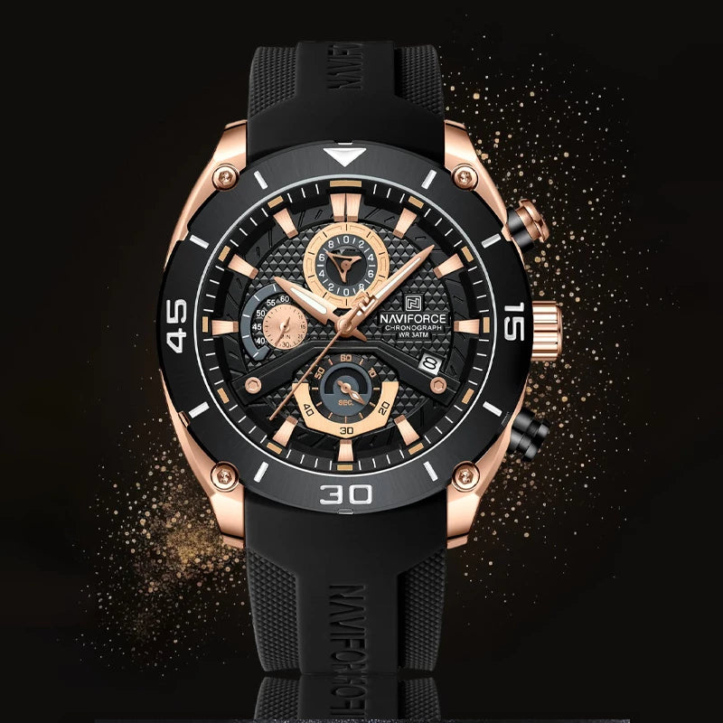 Inspired by the wild motorcycle culture, Naviforce NF8038 features a bold and avant-garde appearance, suitable for young men who dare to show themselves and pursue trendy styles. The uniquely designed multi-function chronograph small dial adds a sense of fun and is visually striking with the clever use of contrasting colors. The watch includes date and day display functions for easy timekeeping. To ensure comfortable wear, the strap is made of lightweight and breathable silicone, combined with vibrant colors to showcase personal charm. With 30 meters water resistance, it is suitable for daily life, and the luminous display ensures clear visibility in any light condition. This watch comes in 6 color options, adding vitality and passion to your daily outfits, catering to different personalities and preferences of men.